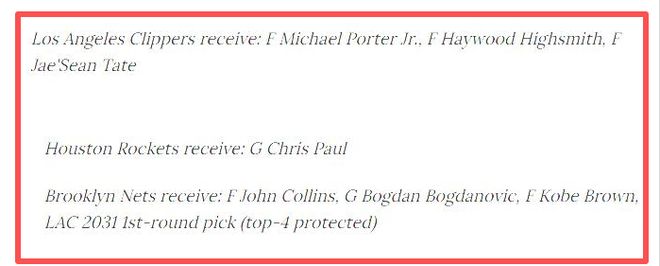 根据多方消息汇总,一笔涉及火箭、快船、篮网的3方交易方案已初现雏形:洛杉矶快船获得前锋迈克尔·波特二世、海伍德·海史密斯、杰肖恩·泰特;休斯顿火箭获得老将克里斯·保罗;布鲁克林篮网获得约翰·柯林斯、博格丹·博格达诺维奇、科比·布朗以及洛杉矶快船2031年首轮选秀权(前四保护)。若这笔交易达成,将实现三方各取所需的共赢局面——快船完成阵容精准升级,摆脱当前困境;保罗时隔多年重回休城,为火箭的冲冠之路添砖加瓦;篮网则清理冗余合同,收获优质选秀资产,加速重建进程。