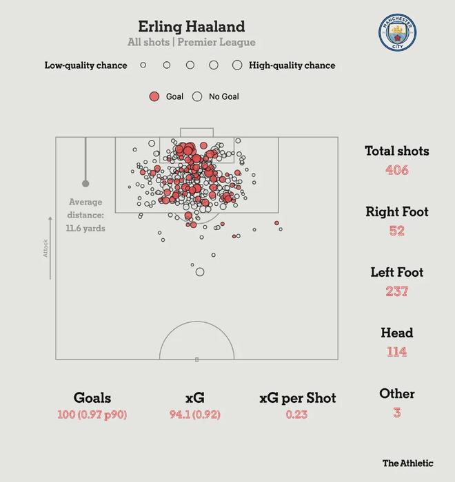 哈兰德的这100个进球一共用了406次射门,其中左脚射门237次(打入71球)、右脚射门52次(11球)、头球射门114次(打入17球)、其他部位射门3次(打入1球)。