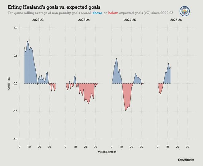从实际进球与预期进球的对比可以看到,哈兰德在来到曼城后的4个赛季里,第一个赛季进球效率最高,第二年出现了一定的滑坡,不过在本赛季又迎来新的强势反弹。